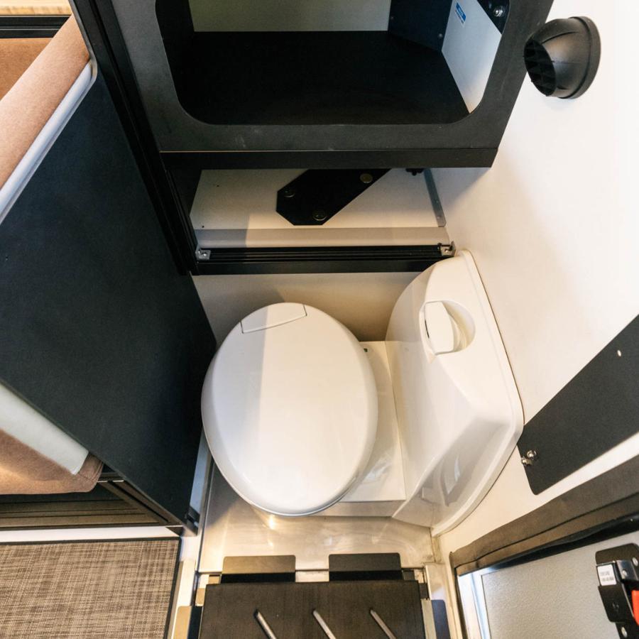 Optional ist ein modernes, verstautes Kassettentoiletten-System verfügbar, das unter einem Klappregal im Badezimmerbereich verborgen ist. Die Toilette lässt sich zum Gebrauch herausklappen und danach wieder platzsparend verstauen. Der tragbare Abwassertank (ca. 18 Liter) kann einfach entnommen und manuell geleert werden.